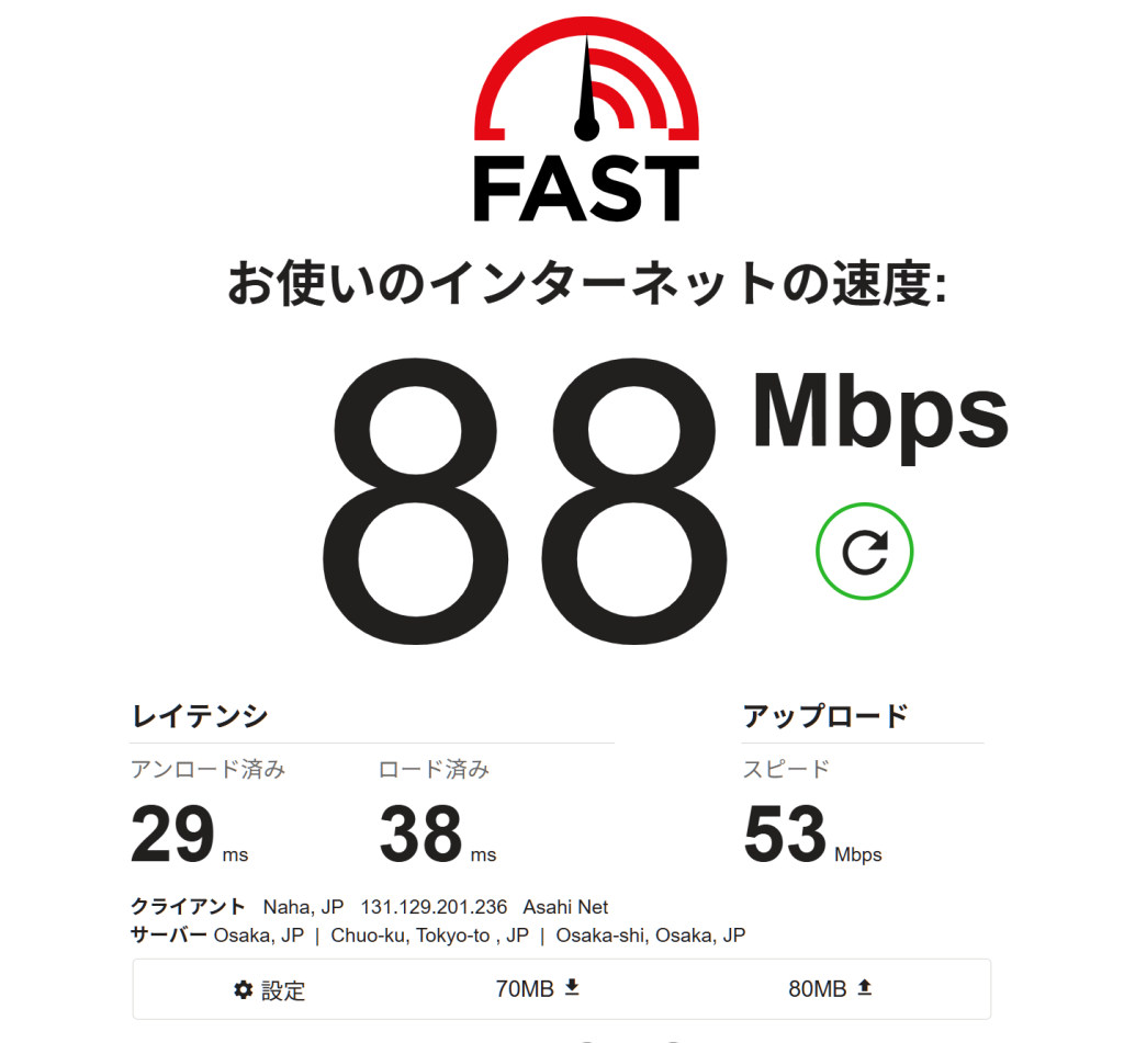 そんなSmile Hotel 沖縄那覇ですが、Wifiの環境は結構良く、今回の宿泊時に計測したスピードは 88Mbps 程度でした。このぐらいのスピードが出ていればYouTubeなども結構安定して見ることができますね。